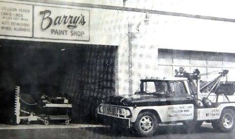 Barry's Paint Shop sign with vintage tow truck outside, showcasing the company's history in automotive repair and collision services.